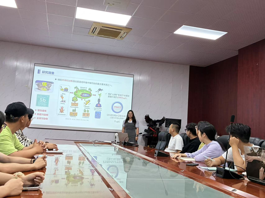 贾晓岑老师以“典型胶体对锑矿区地下水环境中锑迁移转化的影响机制研究”为主题,聚焦“世界锑都”湖南锡矿山北矿区地下水环境中的锑污染迁移问题。她系统介绍了锑在地下水中以胶体结合态为主的赋存特征,并详细展示了团队在锑迁移机制方面的研究成果,包括不同类型胶体对锑的吸附差异、水化学条件对胶体行为的影响以及胶体主导下的迁移路径建模。通过现场调查、室内实验和多模型模拟,并构建了锑迁移的“胶体效应模型”。该研究为解析重金属在复杂水环境中的迁移机制提供了新视角,对矿区地下水污染防控具有重要意义。