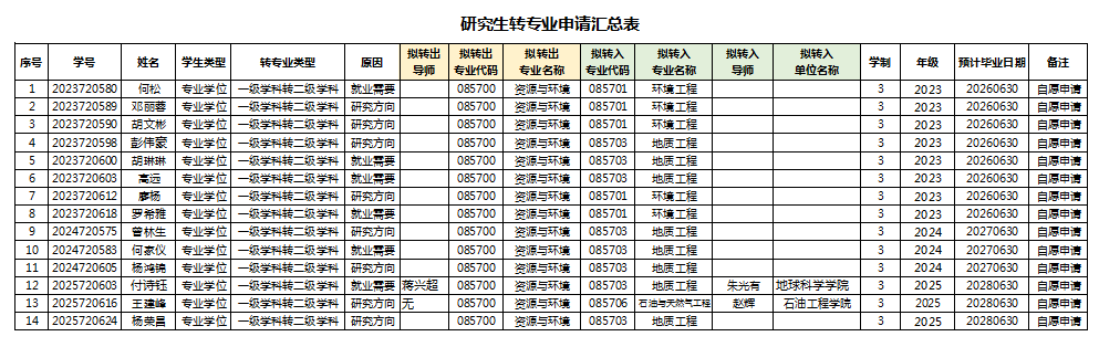根据《bv伟德国际1946研究生学籍管理办法》(长大校发〔2020〕92号)、《关于<bv伟德国际1946研究生学籍管理办法>转专业有关条款的补充解释》(研院发〔2024〕5 号)等文件中关于转专业的相关规定,按照工作进程,经员工申请,导师同意,学院审核,现将2025-2026学年第一学期转专业审核结果公示如下,公示时间:2025年9月19日至2025年9月23日。如有异议,请与教学办联系02769111182曾老师。 资源与环境学院 2025.9.19