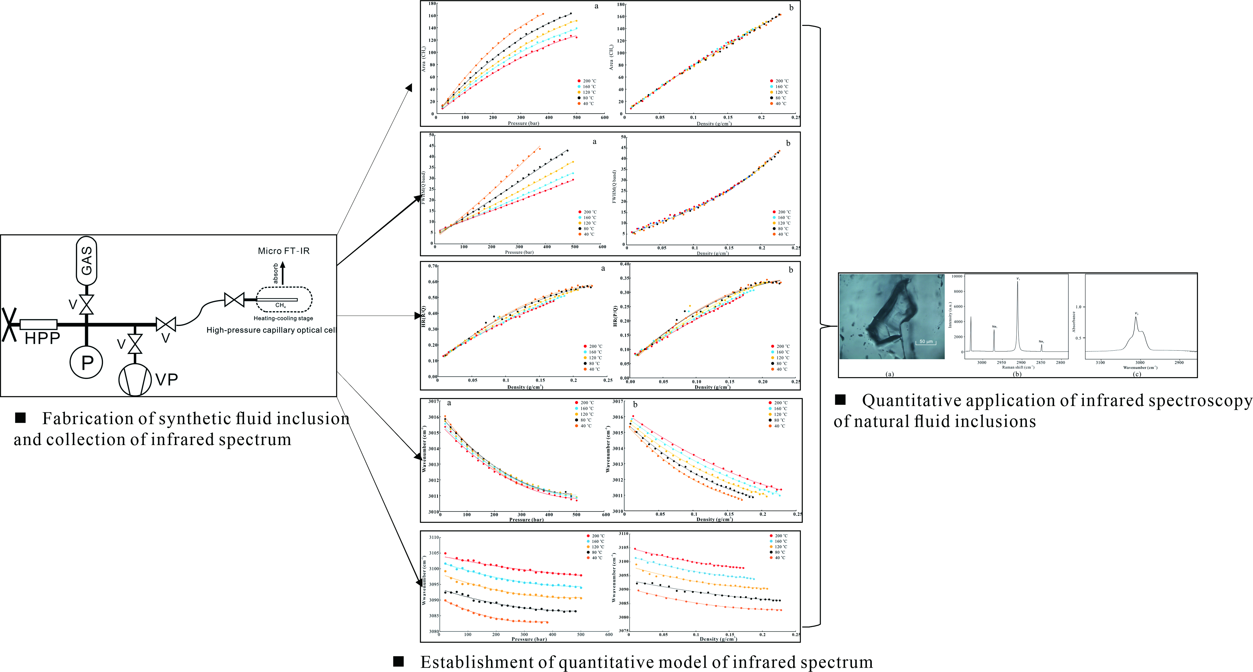本次研究首次建立了甲烷(40-200oC,2-50 MPa)和二氧化碳(40-120oC,6-50 MPa)体系下傅里叶红外光谱参数与温度-压力-密度的定量模型(图1),同时分别对阿尔卑斯山中央区石英脉体内多个纯甲烷天然流体包裹体和莺歌海盆地的纯二氧化碳流体包裹体应用了傅里叶红外光谱的定量方法,此研究不仅创新性的采用傅里叶红外光谱定量分析应用于流体包裹体地球化学研究方向,同时比较了傅里叶红外技术与激光拉曼技术的优缺点,为下一步含甲烷和二氧化碳多元体系傅里叶红外光谱定量打下了基础。黄亚浩为论文第一作者,合作者包括bv伟德国际1946文志刚教授、中石油勘探开发研究院陶小晚高工、杭州地质研究院乔占峰教授等。该研究得到国家自然科学基金资助项目支持。(审核 孟强)