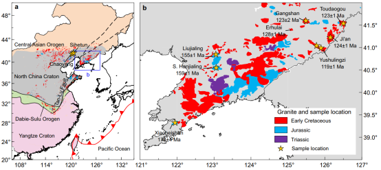 水对大陆地壳部分熔融形成花岗岩至关重要,但其具体来源尚不清楚。靠近海沟的弧岩浆中的水主要来自于俯冲板块的脱水作用。然而,这一机制在解释陆内岩浆的形成时遇到了挑战,因为远离俯冲带的陆内区域难以直接获得来自俯冲板块的水。华北克拉通内部在晚中生代时形成了大量的花岗岩,是研究陆内花岗岩中水来源的理想地区(图1)。