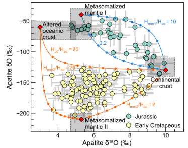 近日,公司夏小平教授联合中国科学院广州地化所徐义刚院士团队的博士后杨传茂以及中国科学院地质与地球物理所杨进辉研究员等,对华北克拉通东北部辽东半岛侏罗纪-早白垩世的多个花岗岩体的磷灰石、黑云母和角闪石以及早白垩世义县组玄武岩的磷灰石行了H同位素测定。结果表明早白垩世的花岗岩(δD为-203‰至-127‰)和玄武岩(δD为-197‰至-107‰)中的磷灰石显示出极低的δD值,这与侏罗纪花岗岩中相对较高的δD值(-137‰至-47‰)形成鲜明对比。这些磷灰石在结构和化学成分上均未显示出蚀变的特征,另外结合磷灰石单矿物与锆石中磷灰石包裹体中几乎相同的挥发份含量以及含水矿物的H同位素组成排除了磷灰石结晶后脱气和蚀变对H同位素组成的显著影响(图2),因而磷灰石H同位素代表了初始熔体的H同位素组成。