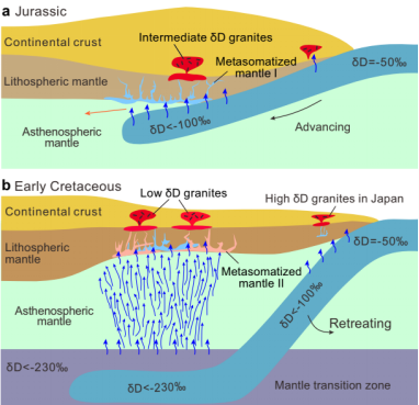 侏罗纪和早白垩世花岗岩为壳幔岩浆混合成因,其H同位素也继承了地壳和地幔的H同位素组成。两个时期的花岗岩具有共同的大陆地壳端元,而地幔端元截然不同(图3)。相比于侏罗纪,早白垩世花岗岩中包含了极低δD值的交代地幔组分。因板片俯冲脱水过程中,D倾向于进入板片脱出的流体中,使得随着俯冲深度增加,板片的δD值不断降低,在地幔过渡带可能出现极低的δD值。相比于侏罗纪花岗岩,早白垩世花岗岩和玄武岩磷灰石的偏低的H同位素组成指示早白垩世岩浆中的水来源于更深的俯冲板片,可能有地幔过渡带的贡献。从侏罗纪到早白垩世H同位素组成的变化与古太平洋板块俯冲作用密切相关。古太平洋板块在侏罗纪沿岩石圈底部前进俯冲,温度相对较低,板片在浅部脱水量较少,相对较高δD的水被带入深部,释放之后交代上覆地幔并进入地壳,形成相对富集D的花岗岩(图4)。到早白垩世,板块转变为后退俯冲,俯冲角度增大,俯冲板片进入地幔过渡带,在其上方形成了大地幔楔,导致地幔过渡带中水上升到浅部交代岩石圈地幔,并最终流入地壳形成晚中生代花岗岩(图4)。