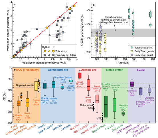 这项研究不仅为华北克拉通内部花岗岩中水的深部起源提供了证据,丰富了对花岗岩形成机制的认识,而且展示了磷灰石H同位素在示踪地球内部水循环方面的巨大潜力。此外,这项工作还提供了一个可验证模型,更大时空范围的花岗岩和玄武岩H同位素的研究可对该模型做进一步约束。