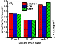 图1干酪根基质模型1、2和3中,对(a) CH4、(b) C2H6、(c) CO2和(d) N2的吸附密度进行了比较,这些吸附密度是基于Langmuir、SDR和SBET模型计算得出(水平虚线表示气体密度的实验值)(审核:孟强)