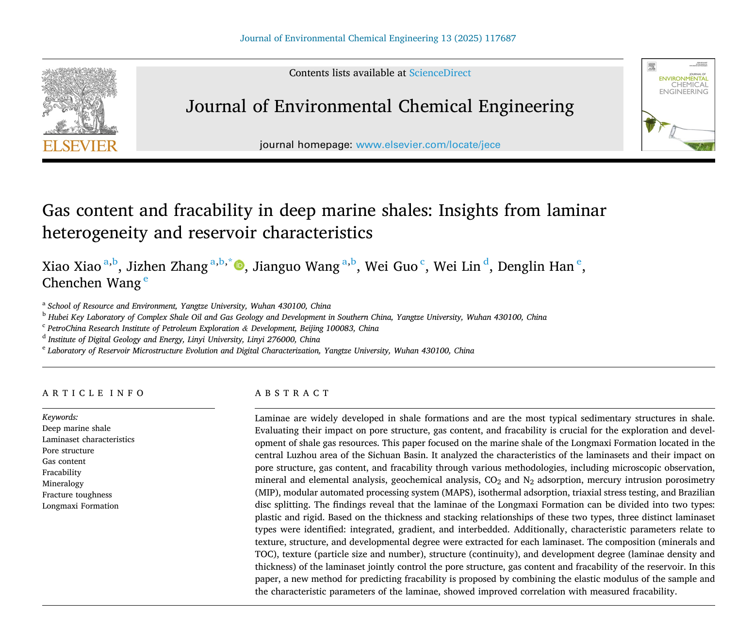(通讯员 张吉振)在全球能源转型背景下,页岩气作为清洁能源的重要补充,其高效开发成为国际能源领域的核心议题。然而,深海页岩的复杂储层特征(如差异纹层层理异质性)对含气性和可压裂性的影响机制尚未完全明晰。针对这一科学难题,bv伟德国际1946bv伟德国际1946在读硕士研究生肖肖在导师张吉振副教授指导下,在国际权威期刊《Journal of Environmental Chemical Engineering》(JCR 1区,IF=7.2)发表题为"Gas content and fracability in deep marine shales: Insights from laminar heterogeneity and reservoir characteristics"的研究论文,首次系统揭示了多类型复杂纹层层理结构对页岩储层性能的差异性控制规律,为深层页岩气勘探开发提供了科学理论支撑。bv伟德国际1946bv伟德国际1946为第一完成单位。