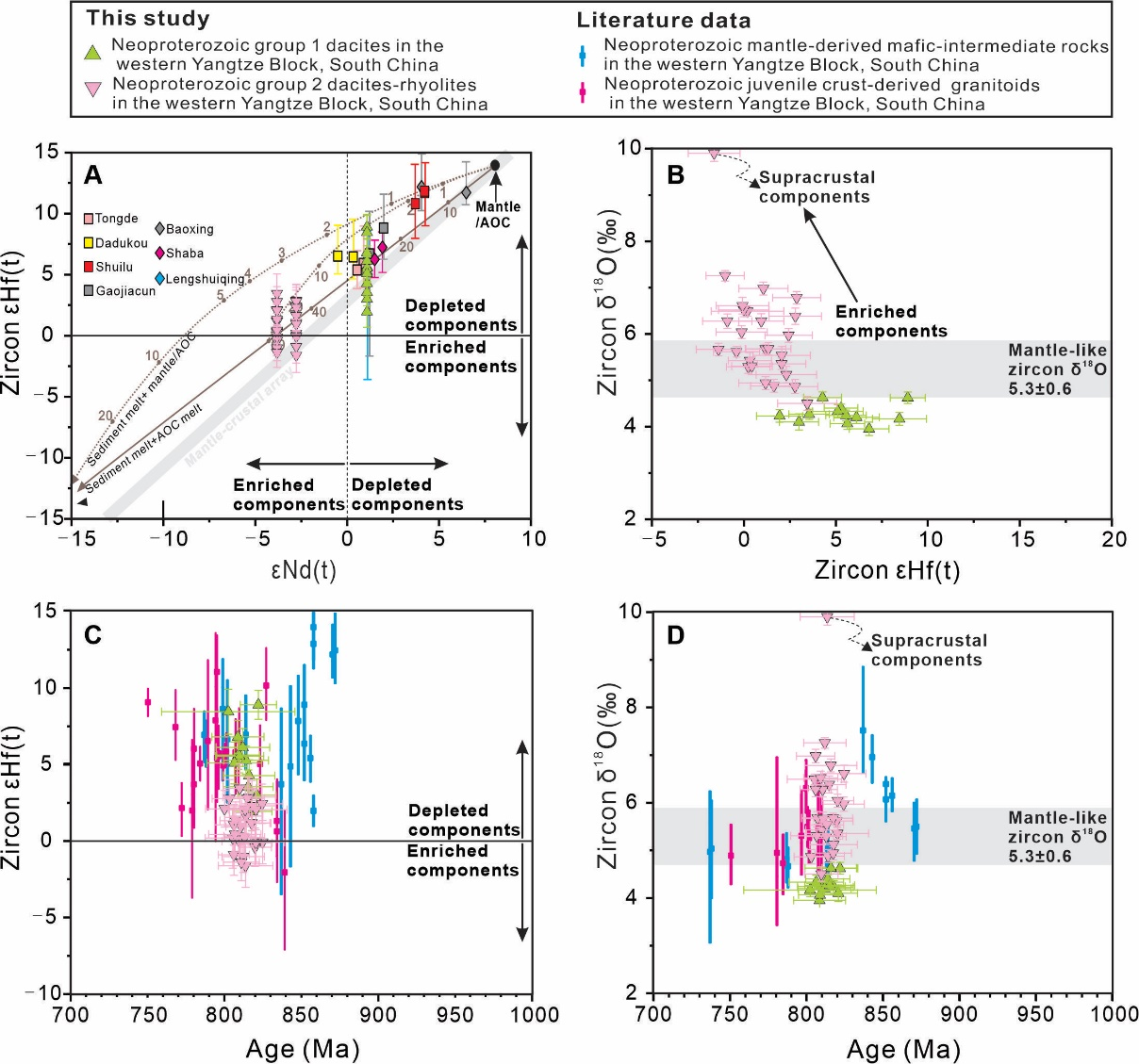 结合扬子西缘新元古代俯冲构造背景,研究团队提出受俯冲板片熔体(低δ18O)交代的地幔岩浆上涌形成新生弧下地壳,进一步熔融产生低δ18O硅质岩浆,交代地幔/新生地壳来源的热量加热上覆成熟地壳发生部分熔融,形成高δ18O的硅质岩浆(图5)。
