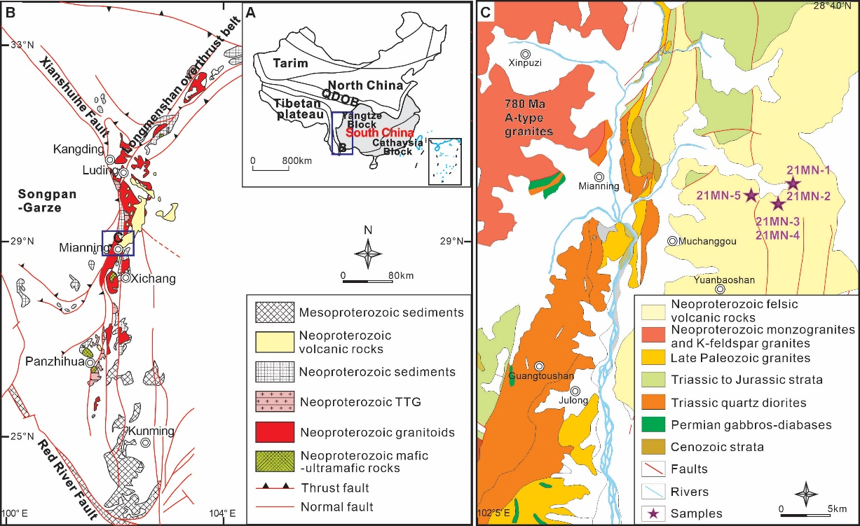 为了系统揭示我国华南扬子周缘地球早期新元古代大陆地壳的形成和演化过程,公司朱毓特任教授及其合作者选取扬子西缘冕宁地区新元古代英安岩和流纹岩进行系统研究(图1),通过全岩地球化学及锆石U-Pb-Hf-O同位素约束其地壳源区属性及演化过程。