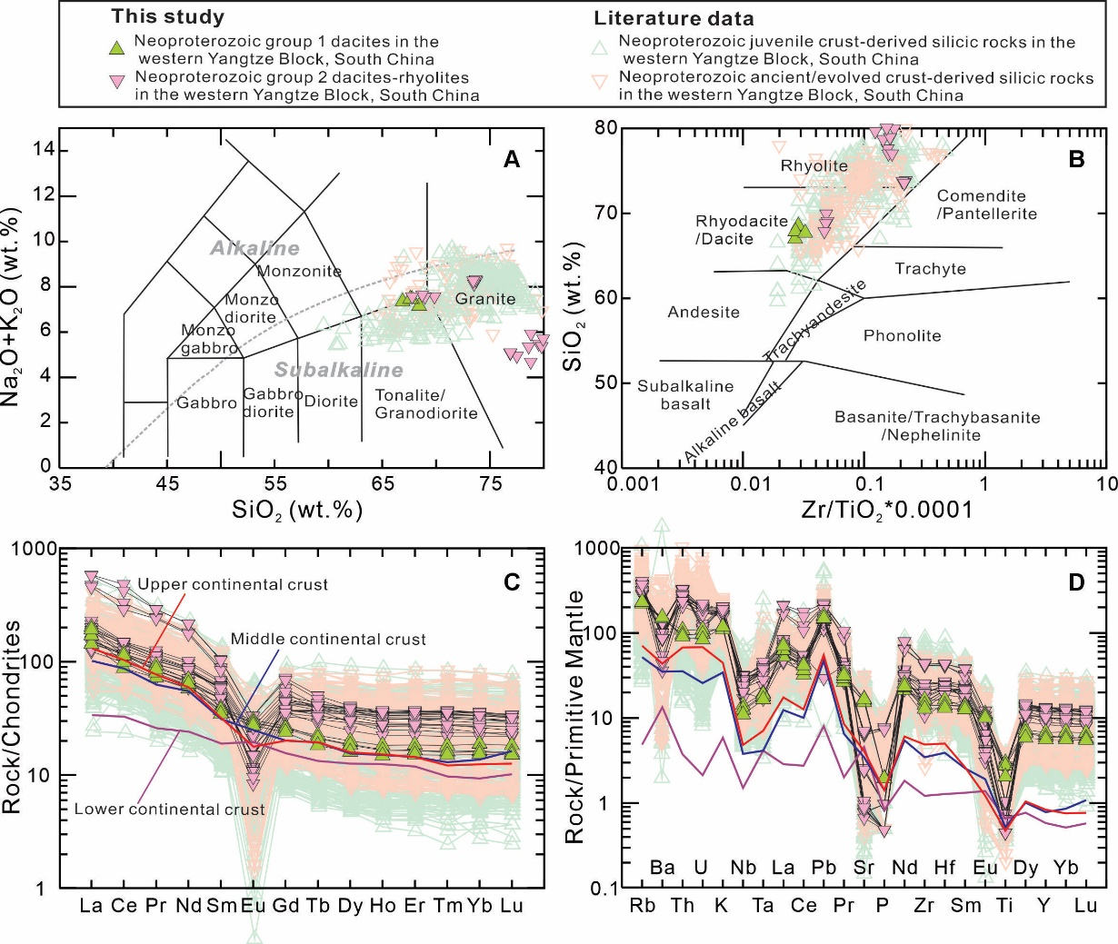 大陆弧是汇聚板块边缘的构造活动区,记录了大陆地壳生长和再造的一系列复杂地壳过程。厘清大陆地壳的形成和演化过程是地球科学最为基础且重要的目标之一。作为大陆地壳的重要组成部分,产自于大陆边缘弧背景下的硅质岩浆(花岗闪长岩-花岗岩-英安岩-流纹岩等)通常富集SiO2和大离子亲石元素,亏损MgO,FeOT和Ba,Sr,Eu,P和Ti等高场强元素,他们被解释为幔源岩浆的强烈分异产物或者古老/新生地壳的部分熔融产物,因此,不同类型的硅质岩浆记录了不均一的大陆地壳组分的重熔和循环作用。我国华南扬子周缘分布有大量的新元古代长英质火山岩和侵入岩,它们被认为是Rodinia超大陆汇聚与裂解过程的岩浆产物。因此,这些酸性岩浆是揭示华南新元古代大陆地壳熔融与物质循环的重要研究对象。