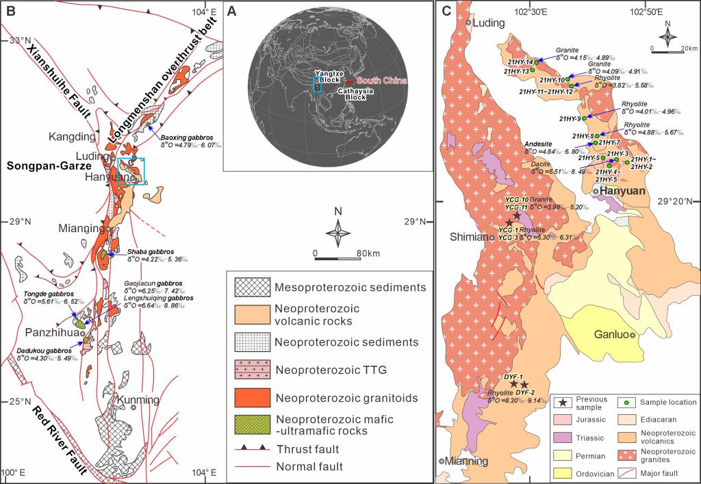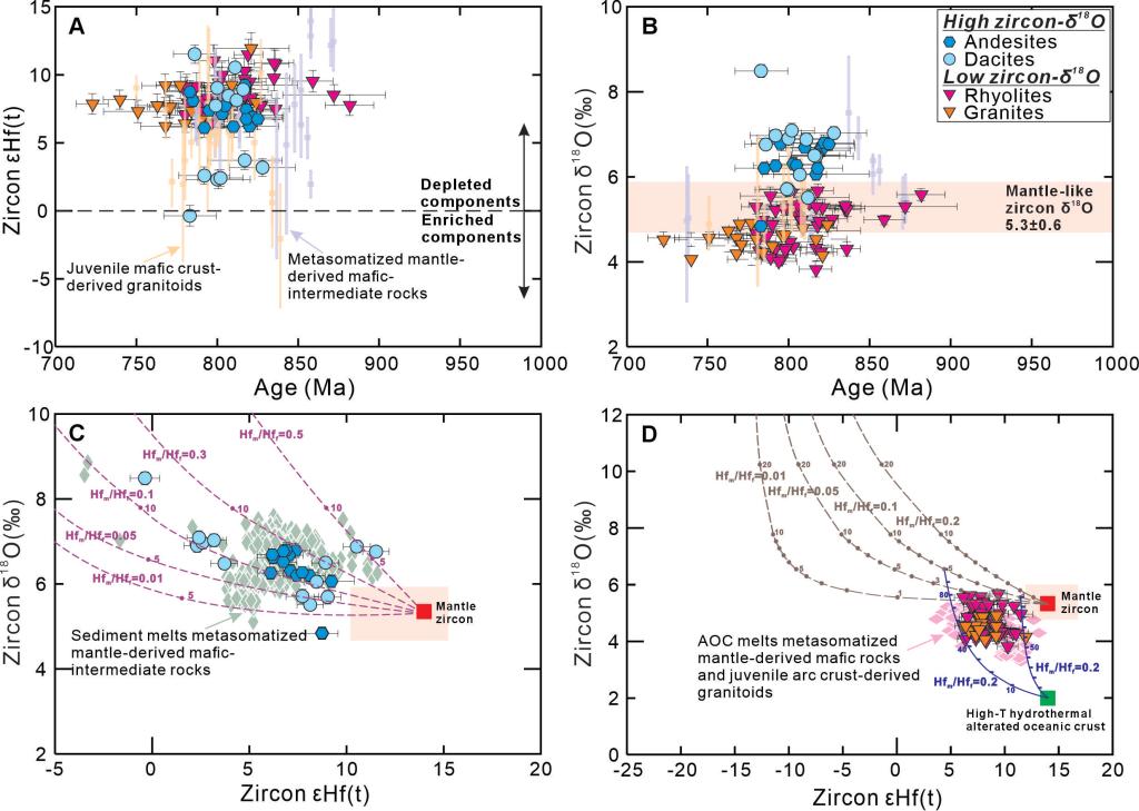 Ca. 820-760 Ma流纹岩和花岗岩具有高的全岩SiO2 (73.05–78.49 wt.%)、正的全岩εNd(t) (-0.69 to +1.99)值、正的锆石εHf (t) (+6.16~+11.9)值以及亲地幔-低于地幔的锆石δ18O(3.82‰–5.58‰)值(图3),这些低δ18O的流纹岩和花岗岩来自于新生镁铁质弧下地壳的部分熔融,而这些新生镁铁质下地壳来源于俯冲板片组分交代地幔源区岩浆的补给。
