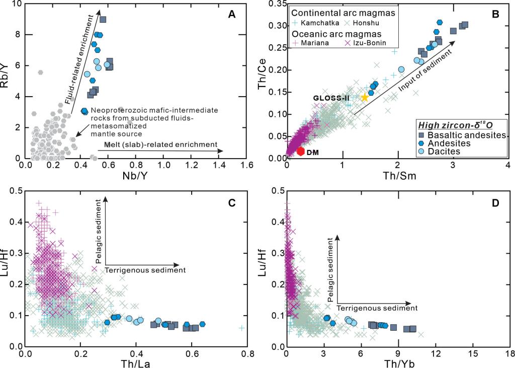 Ca. 807-802 Ma玄武安山岩-英安岩显示高的MgO (2.01–9.06 wt.%), K2O (2.43–4.70 wt.%), Rb/Y (2.99–8.98), Th/Ce (0.15–0.31), Th/Sm (1.51–3.21), Th/La (0.30–0.64)和Th/Yb (3.20–10.1)比值(图2),结合负的全岩εNd(t) (-4.22 ~ -0.86)值、变化的锆石εHf(t) (+1.80~+8.86)和高的δ18O值(高达7.09‰)(图3),这些高δ18O的玄武安山岩-英安山岩起源于俯冲流体和沉积物熔体交代的地幔源区。