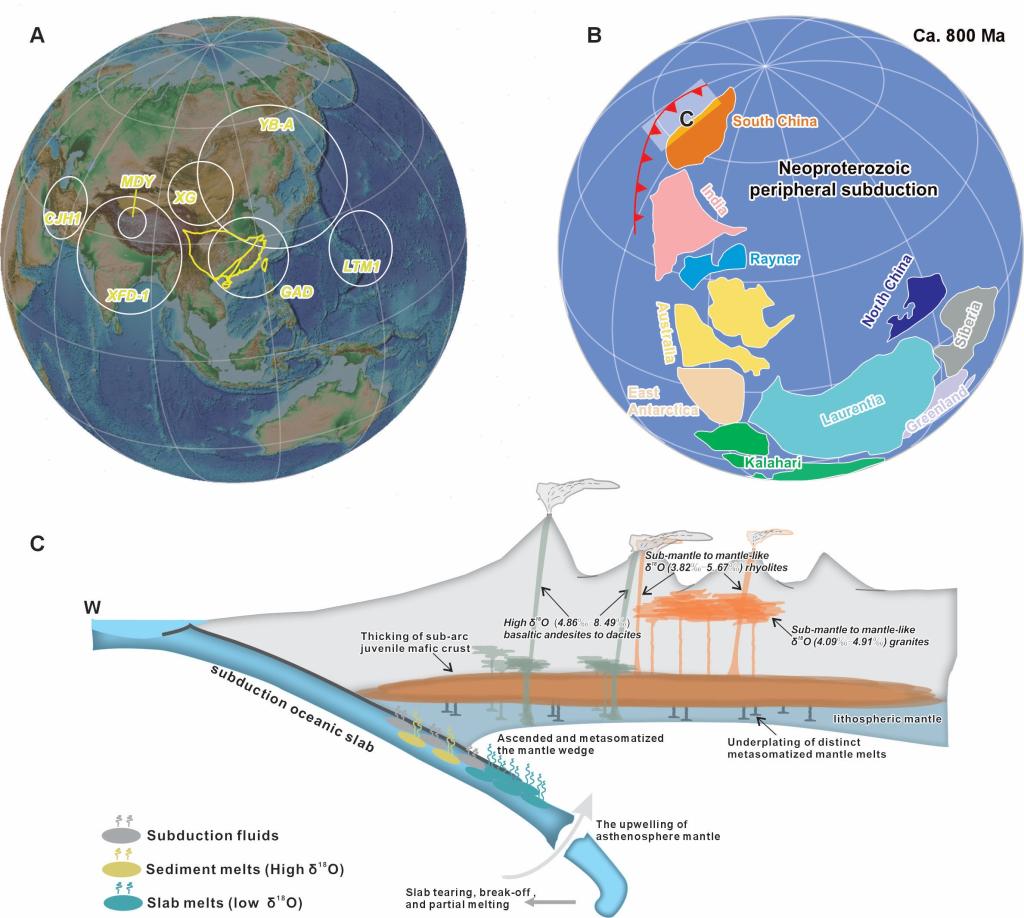 结合华南新元古代古地磁重建(图4A-B),研究团队提出扬子周缘在新元古代长期处于高纬度的边缘俯冲背景下。Rodinia超大陆长期持续的外周俯冲作用将不同的交代介质(俯冲流体、沉积物熔体和板片熔体)引入弧下地幔楔中(图4C),导致了Rodinia超大陆西北部边缘俯冲体系下扬子西缘新元古代地幔楔的非均质性和弧岩浆的锆石δ18O多样性。