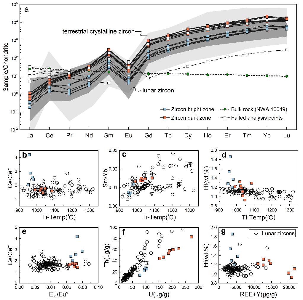 月球,这个曾长期被认为极度干燥的星球,近20年来其内部已经被证明含有一定量的水。这些内部水的来源——究竟是与生俱来的“内生水”,还是后期天体撞击带来的“外生水”——就成为当今行星科学研究中一个备受争议的谜题。早期研究多依赖磷灰石、火山玻璃、熔体包裹体等研究对象,但这些研究对象易受岩浆去气、太阳风注入、宇宙射线散裂及地球污染等后期过程改造,难以追溯原始水源。相比之下,锆石具有较好的物理化学稳定性,能够有效抵抗后期扰动,成为保存原始岩浆水信息的理想矿物载体。