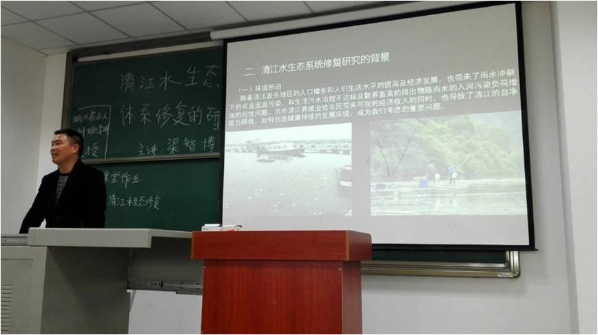 (见习记者 徐紫霞)3月18日上午10点左右,地环学院在武培B105召开了清江水生态系统修复研究讲座。本次讲座由湖北茂源生态有限公司总工程师梁智博老师主讲,老师和同学们共同聆听了讲座。