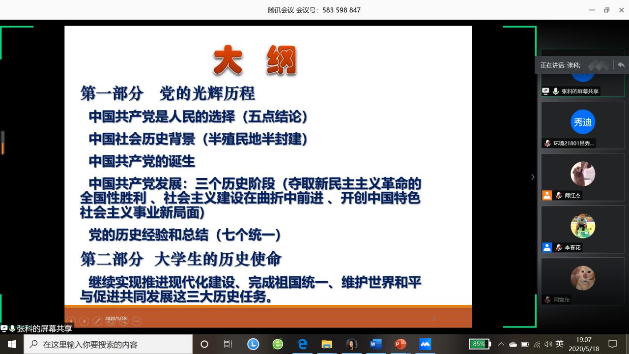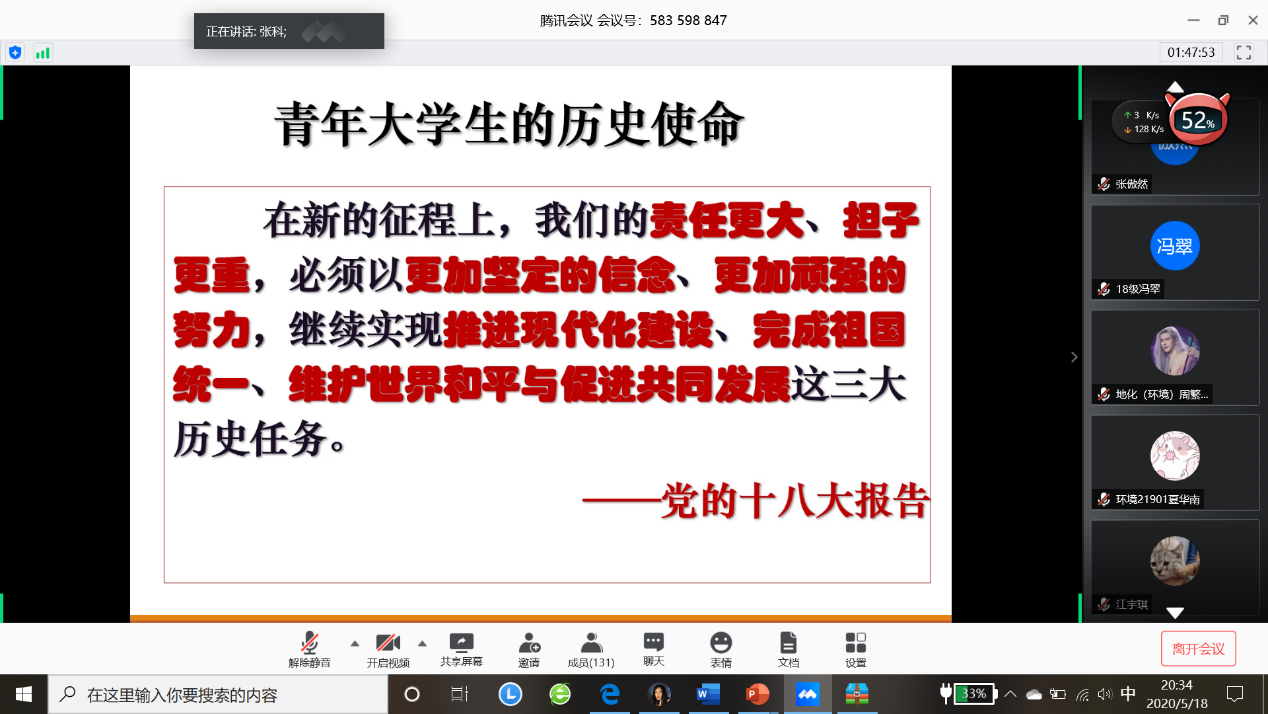 (图/文:吕秀迪)为进一步做好公司党员发展工作,加强对发展对象和入党积极分子的教育和培养,引导其提高思想觉悟,保证发展新党员的质量。bv伟德国际1946于2020年5月18日晚19:00以线上腾讯会议的形式举行了2020年上半年入党积极分子和党员发展对象培训会议。公司党委书记张科主讲,党委副书记范梅英参加、本科员工工作党支部书记李春花主持,共130余名入党积极分子和党员发展对象线上学习。