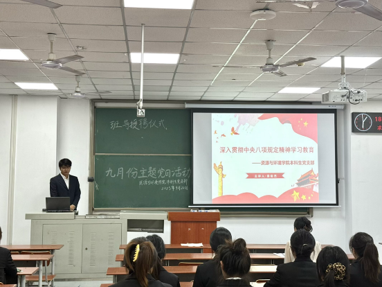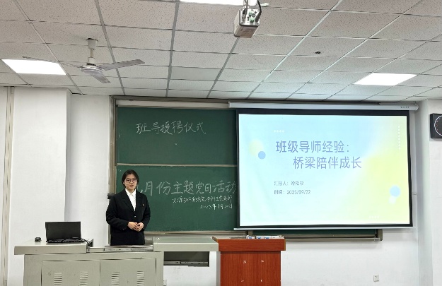公司本科生党支部召开九月支部主题党日活动暨班导授聘仪式 (通讯员 张子恒/图 谭润格 孙文静/文)2025年9月22日下午6:00,公司本科生党支部于武教A104召开“党建引领聚合力,实干笃行促发展”九月份主题党日活动暨班导授聘仪式。本次活动由黄宇同志主持,党支部书记刘娥老师及全体员工党员参加。 会议第一项,黄宇同志带领全体党员重温入党誓词,坚定理想信念。随后,全体党员由黄宇领学《中国共产党章程》第八章至第十一章,要求同志们切实将党章要求内化于心、外化于行。接下来,由李安宁同志和袁俊杰同志讲授微党课,分别以80周年阅兵式和深入贯彻中央八项规定精神为主题,带领同学们深刻领略大国风采与民族精神,理解中央八项规定的核心要义与实践要求。同学们围绕 “传承抗战精神,勇担时代使命,作为新时代青年我们如何在强国建设中彰显青春力量?” 主题开展交流研讨。党员们结合自身经历踊跃发言,表示将坚定信念,把握目标,以更强的责任感投入班级建设与员工工作,融小我于学校建设大我之中。 会议第二项,22 级三位优秀班导结合自身班导经历与辅导心得,向 23 级班导分享四级备考节奏与实用方法,助力 23 级班导更好地发挥引领作用,践行公司四级“传、帮、带”理念,合力提升学院25新生英语水平。 会议第三项,刘娥书记为班导颁发聘书。 活动结束后,刘娥书记进行总结发言。她充分肯定本次主题党日活动的组织成效与学习成果,强调此次活动既是一次深刻的爱国主义教育,也是一次严肃的纪律作风教育,有效帮助全体党员提升了思想认识、强化了责任担当。同时,勉励全体党员牢记使命,严于律己,发挥带头作用,在学习工作中放飞青春理想。(审核 刘娥)