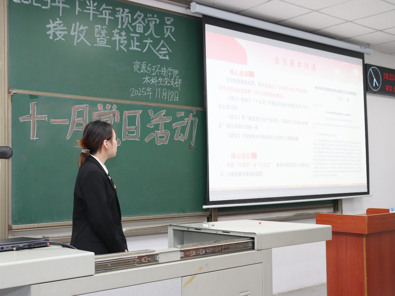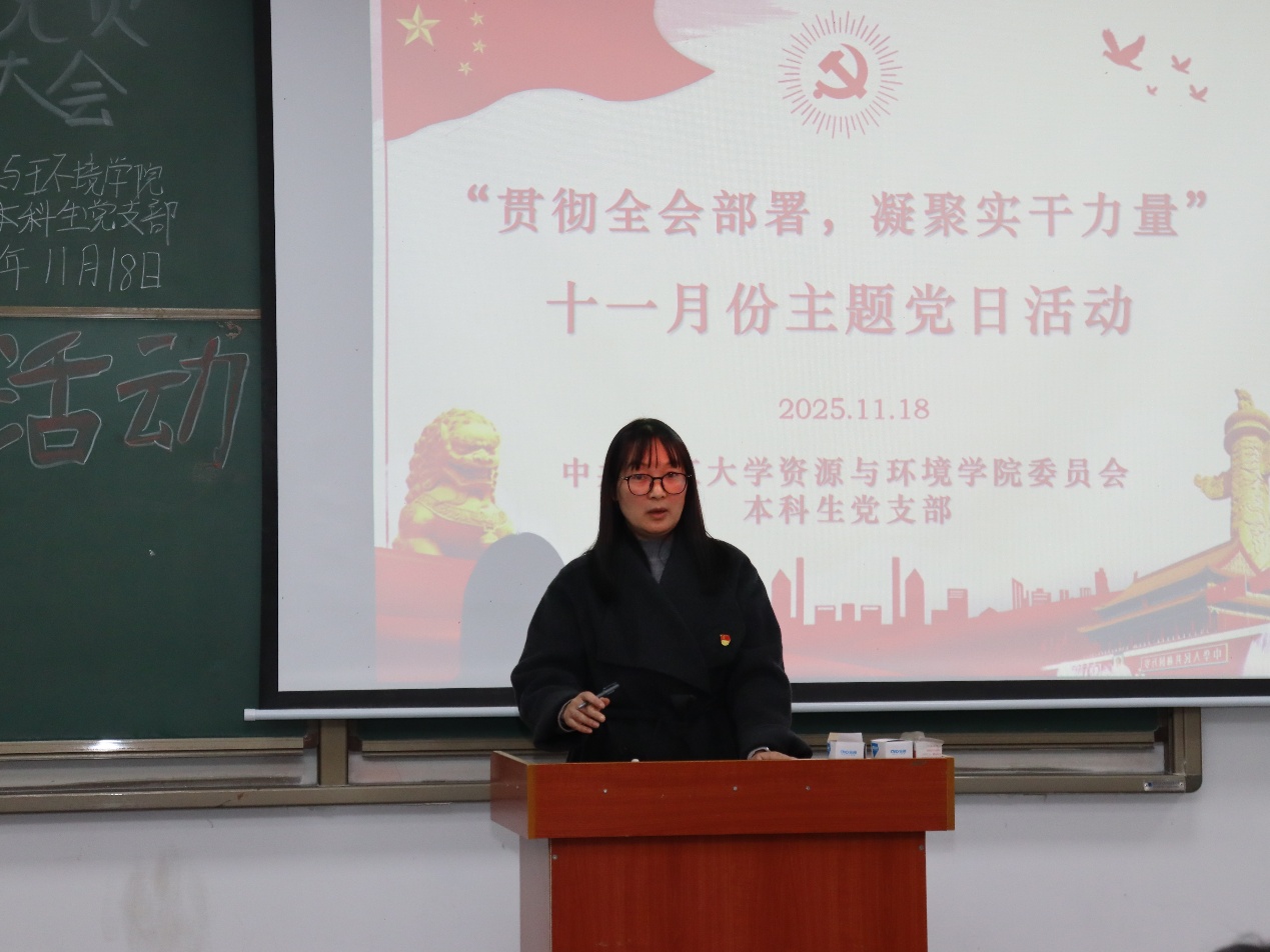 (通讯员 孙文静)2025年11月18日下午6:00,本科生党支部于武教A106召开以“贯彻全会部署,凝聚实干力量”为主题的十一月支部主题党日活动。本次活动由黄宇同志主持,学工办主任李春花老师及全体员工党员参会。 会议伊始,全体党员诵读《中国共产党章程》第一章,深入剖析党的章程。随后由张思阳同志开展微党课学习,带领同志们深悟全会精神。接下来,由魏嘉豪同志以“走读地质文脉,守护绿色发展”为主题讲授微党课,进一步强化全体党员的初心使命。同学们就“结合岗位实际,谈谈学习贯彻党的二十届四中全会精神的心得体会”相关主题展开热烈讨论。大家表示要夯实专业基础,勇攀科研高峰,加强理论学习,深刻理解全会精神的核心内涵与实践要求,运用所学知识服务社会、服务人民,在解决实际问题的过程中增长才干。整个学习过程在快乐的氛围中结束。 活动结束后,李春花老师总结发言。她表示,此次党日活动不仅强化了支部党员的理论素养和使命感,更激发了大家将爱国情、强国志、报国行自觉融入学习和未来事业的热情。希望全体党员继续坚守初心使命,勇于担当作为,为学院和学校的发展贡献自己的力量。 审核(李春花)