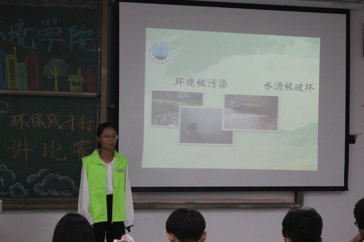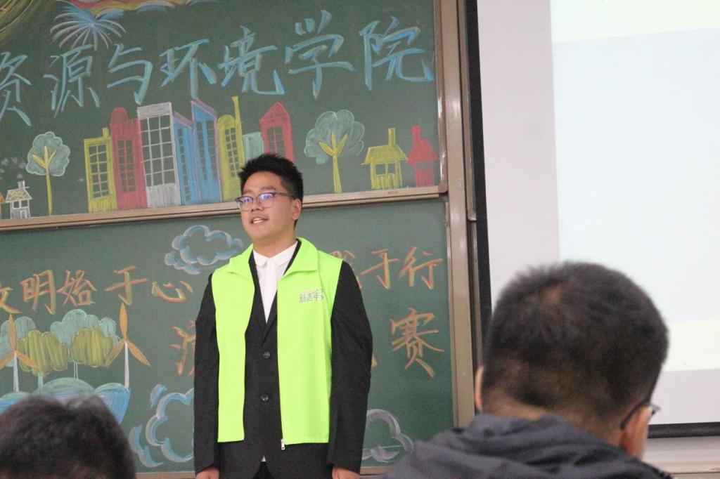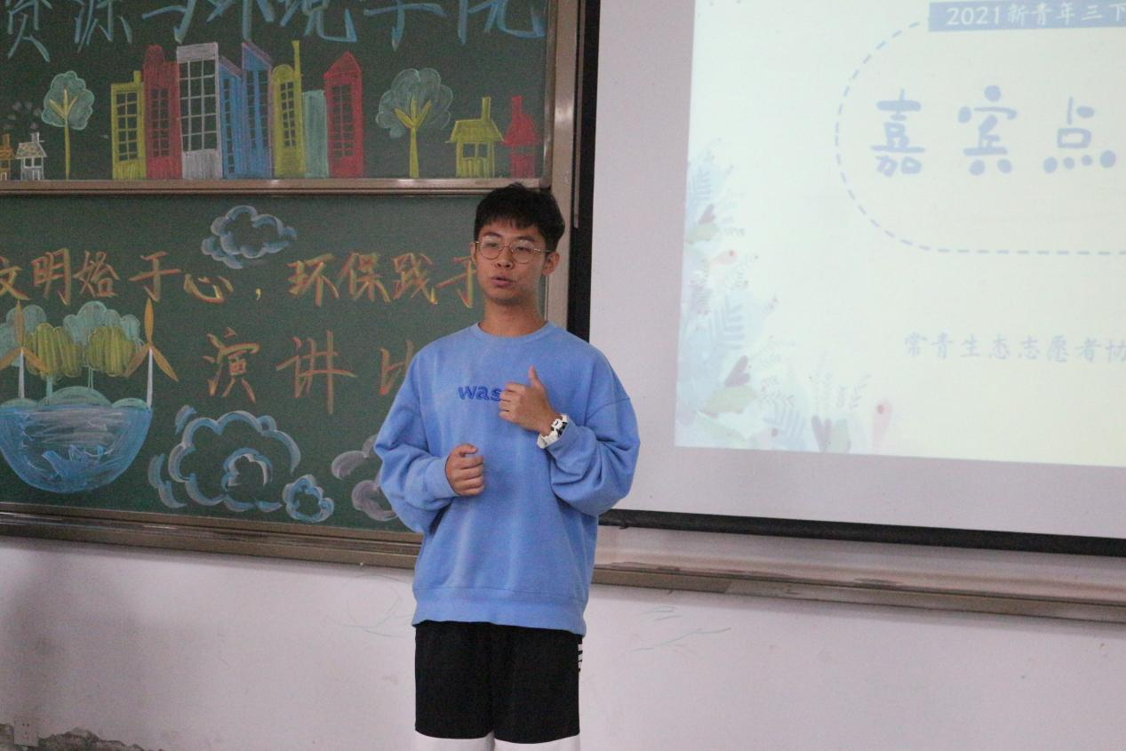 接下来上台的是魏千府同学,他演讲的主题是“生态环境保护,我们与行动”。魏千府同学上来几个直击人心,引人深思的问题让大家不由得认识到地球生态环境的恶劣,他播放的几个短视频也让我们意识到我们现在环境保护任务的艰巨。他铿锵有力的声音传达着他对环境保护重要性的肯定。