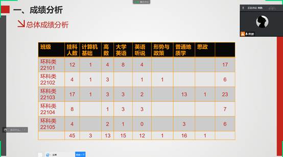 “暑往寒来,各位同学经历了老员工涯的第一次考试,有取得好成绩的同学,也有失利挂科的同学,希望大家都能沉下心反思得失,来年取得更大进步”,会议开始年级辅导员黄鹏老师给各位班长和学习委员说到。本学期一年级共开展必修课、公选课等14门课程,黄老师统计了各班同学考试成绩,并一一分析,重点分析了不及格科目及不及格同学情况,指出了目前学习过程中存在问题,要求班导及各班班长、学习委员认真分析本班成绩,思考如何带好班级,同时利用寒假对挂科同学提供帮助,争取开学补考通过,力争不让一个同学掉队。