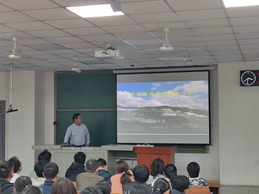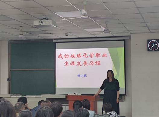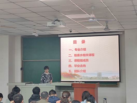 在大会第三项中,学院各研究团队的导师代表分别上台进行了导师介绍,地球化学系的吴越老师和陈果老师分别介绍了岩矿地球化学和有机地球化学的导师团队,优秀的团队力量和先进的实验设备都让大家叹为观止。而水环系的贺美老师,陈燕飞老师,陈彦美老师对于水环境,地表水以及地下水各方面的详细介绍,再次获得了现场的掌声雷动,尤其是陈燕飞老师慷慨激昂的一句“选择水文水资源专业就是选择美好的人生!”,更是引起了同学们的热烈反响。