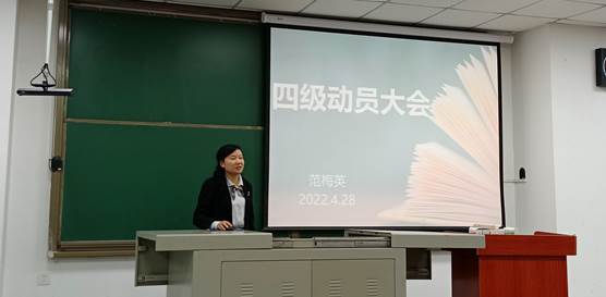 大会最后一项,党委副书记范梅英老师宣读学院四级专项奖励办法,同时从考研、就业、个人成长发展等多个方面阐述四级的重要性与必要性,并对同学们的英语学习提出了几点建议,她鼓励同学们树立坚定必胜的信心,要进行科学规划,及时总结,做到有计划、有方法、有步骤的学习,以饱满的精神状态全身心投入到四级备考中。