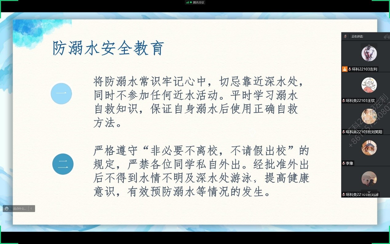 首先,由各班安全委员为同学们详细讲解PPT上相关内容,如何去避免溺水情况的发生、溺水时如何自救、遇到他人溺水应当如何在保护自身安全基础上去帮助他人,同时强调了在疫情期间学校的防疫相关规定,留校员工要严格遵守“非必要不离校,不请假不离校。” 坚持完成每日健康打卡、晚点名和核酸检测等,在此基础上安全委员播放了安全教育视频,让同学们理解更加透彻。