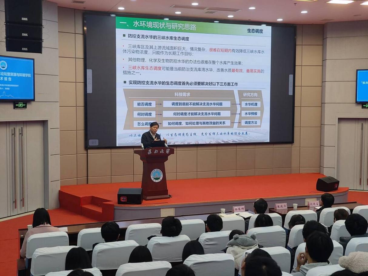 2023年12月14日,学院邀请湖北工业大学二级教授、武汉大学、三峡大学博士生导师,湖北省有突出贡献中青年专家刘德富教授做客bv伟德国际1946武汉校区,在石油科技大楼学术报告厅进行了主题为《三峡水库支流水华机理及其防控技术》的学术讲座。本次讲座由徐耀辉教授主持,bv伟德国际1946党委副书记敖廷华、张昌民教授,以及水文与水资源工程和环境生态工程等相关专业近300名师生参加。 刘德富教授团队从事三峡水库支流水华机理相关研究二十余年,取得了一系列相关成果,发表于Water Research、Sci China Tec Sci、《中国科学》、《水利学报》、《水科学进展》等重要期刊。本次讲座深入浅出,从水环境现状与研究思路、干支流水动力特征分析、支流水华生消机理研究、支流水华预测预报研究、三峡水库生态调度研究和生态调度相关课题建议六个方面给长大师生展示了该团队的系列成果及其研究过程中是如何发现、分析和解决支流水华等相关问题。最后,刘德富教授进行总结并寄语同学们:任何研究都不是一蹴而就的,需要长期不懈的坚持与严谨求实的精神,要注重理论知识与实践研究相结合。 报告结束后,与会师生踊跃提问,与刘德富教授就报告内容进行了细致且深入地探讨和交流,现场气氛十分热烈。 会议现场照片 刘德富,男,汉族,1962年9月出生,湖北枝江人,中共党员,博士,湖北工业大学二级教授,武汉大学、三峡大学博士生导师,湖北省有突出贡献中青年专家,享受国务院政府特殊津贴专家。兼任中国水利学会水力学专委会副主任,湖北省水力发电工程学会副理事长,三峡库区生态环境教育部工程研究中心技术委员会主任等。