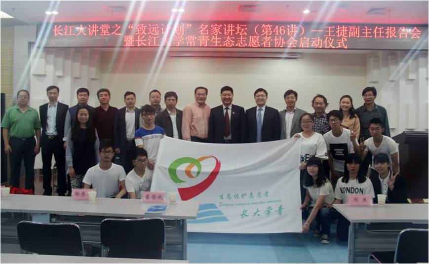 (员工记者 齐玉琴 见习记者 徐紫霞/文 员工记者 曾宪/摄)4月26日下午2时许,“长江大讲堂之‘致远计划’名家讲坛第46讲暨bv伟德国际1946常青生态志愿者协会启动仪式”在武汉校区图书馆二楼报告厅举行。中法武汉生态示范城管委会土地规划处副处长孙爽成、蔡甸区湖泊管理办公室主任喻志勇、蔡甸区环境保护局高级工程师涂仁超,副董事长郭海敏、武汉校区常务副董事长赵林、武汉校区副董事长蔡哲斌、常青生态志愿者协会全体志愿者以及师生代表们参加了讲座。