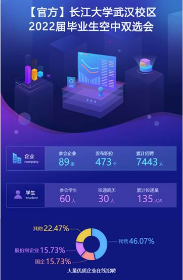 参加本次双选会的企业共有89家,共发布职位数量473个,招聘人数7443人。参加本次双选会的员工共有60人,参与投递人数30人,简历投递量135份。公司员工积极踊跃地参加了此次线上双选招聘会,报名人数占总人数的24.32%,报名人数位居各学院第二。
