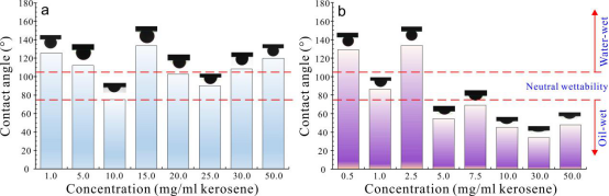 图1 不同浓度非烃(a)和沥青质(b)老化后砂岩岩片接触角值及对应润湿性特征