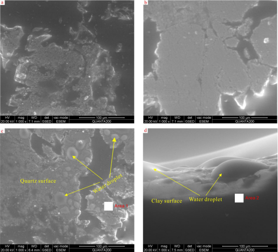 图2 未被老化的(a)和不同浓度沥青质老化岩片(b~d)孔隙内水滴的ESEM图像