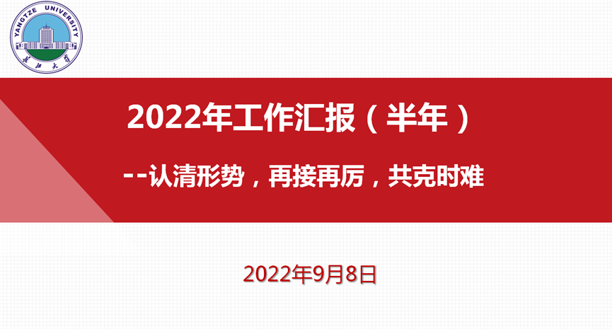 硕果累累,未来可期。梦想新年开门红,“水文水资源工程”获批国家一流本科专业;课程建设上台阶,“资源与环境概论”获推荐湖北省一流本科课程;实验室改革传喜讯,“油气地球化学与环境湖北省重点实验室”获批建设;科学研究出硕果,学院国家自然基金获批8项,位居全校榜首;员工工作精益求精,四级通过率再提升,稳居全校前列;教授团队建设成果、教师个人荣誉、科技成果产出百花齐放。会议第二议程,学院经理文志刚作题为“2022年工作汇报(半年)—认清形势,再接再厉,共克时艰”的工作报告。