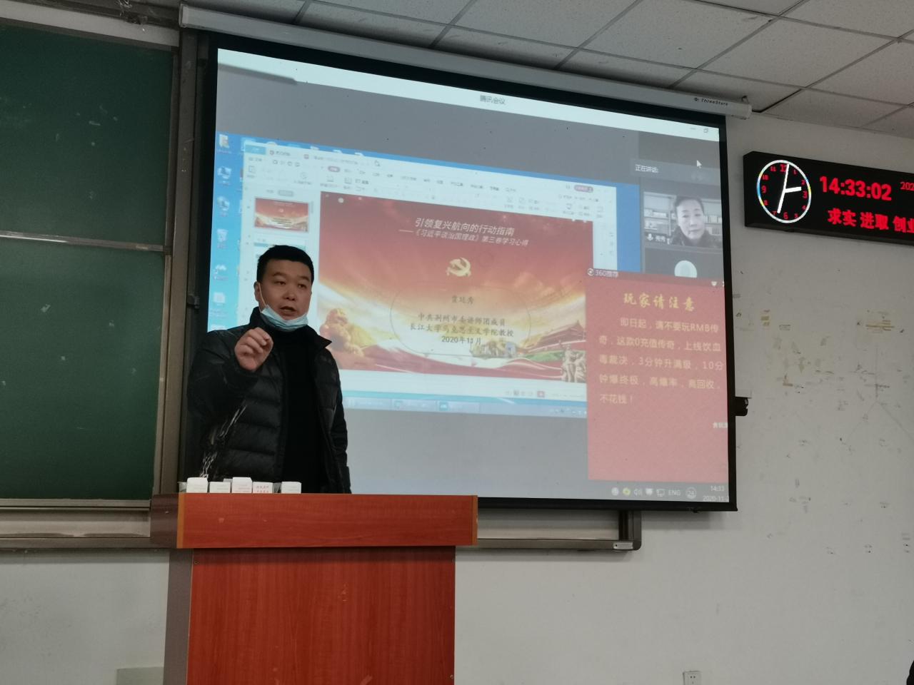 本次大会主要采用线上线下相结合的方式进行,由张科书记主持,贾廷秀教授主讲。贾廷秀教授围绕《习近平谈治国理政》第三卷的内容,主要从《习近平谈治国理政》第三卷的背景、主线、主要内容及创新点四个方面进行了阐述。她谈到,《习近平谈治国理政》第三卷是在中国面临百年未有之大变局,全党全国各族人民决胜全面建成小康社会、决战脱贫攻坚,党的理论创新成果日益深入人心,中国智慧、中国方案加快走向世界的大背景下编辑出版的,编辑出版第三卷是党和国家政治生活中的一件大事,也是马克思主义在中国大众化进程中的一件大事,对于宣传党的创新理论、激扬人民奋斗实践、展示新时代中国和中国共产党的形象,具有重大现实意义和深远历史意义。《习近平谈治国理政》第三卷面向理论发展、面向人民大众、面向国际社会,既系统展现习近平新时代中国特色社会主义思想的科学体系,又注重反映党的十九大以来具有重大突破、重大创新、重大发展意义的思想观点,守正创新形成了领袖著作编辑工作的新理念新体例新规范。
