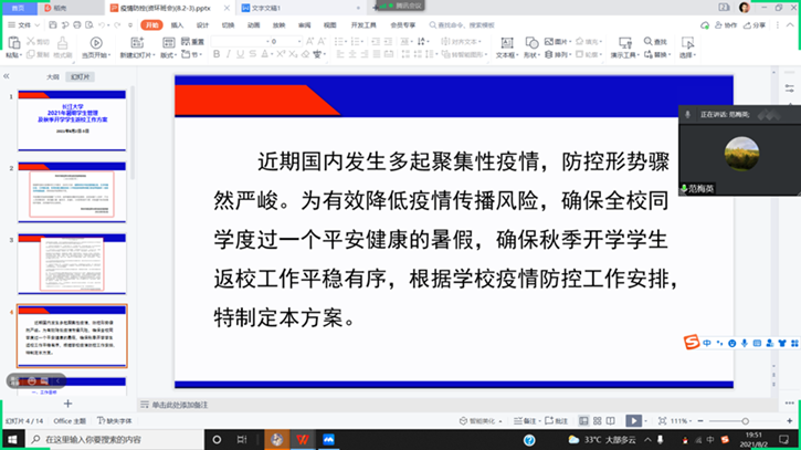 班会上篇围绕最近国内突发的疫情情况,通报了当前疫情防控形势,进行了疫情防控政策、暑期疫情防控的宣讲,并向同学们提出了每日打卡、非必要不外出、非必要不返校、积极注射疫苗、在校生服从管理等五项强制性要求,力争将本校员工的感染风险降到最低;除此之外,班主任也借此班会对员工情况进行摸排,了解员工生活、学业、身心等状况。