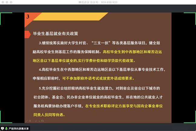 (通讯员 刘于民 图/文)在新冠疫情初步得到控制的四月,bv伟德国际1946毕业生陆陆续续投入工作岗位,大三年级员工对就业细节一知半解,为使他们了解国家形式、就业政策等,bv伟德国际1946严丽萍老师于4月28日通过腾讯会议开展了一次线上就业指导大会。