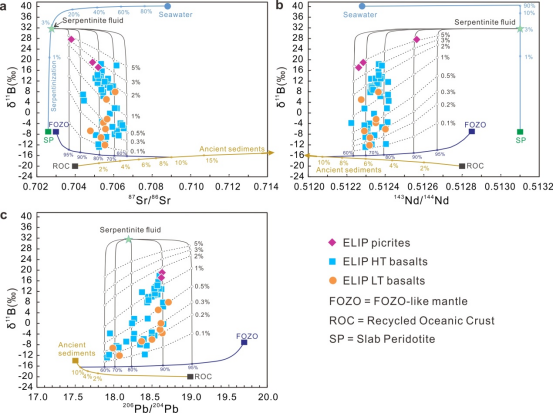 研究团队发现,峨眉山玄武岩和苦橄岩总体具有比洋中脊玄武岩(MORB)和洋岛玄武岩(OIB)更高的B含量(1-53 ppm)、B/Ce比值(0.02-1.59)和更重的B同位素(δ11B高达 +27.62‰)(图2a-b),显示一个亏损B的端元向另一个富集B的端元演化的趋势(图2)。前人曾提出,峨眉山地幔柱源区主要由FOZO型亏损地幔与EM1富集组分(再循环洋壳+沉积物)组成。该模型虽然可以解释峨眉山岩浆岩Sr-Nd-Pb同位素组成,但是却无法解释其B同位素组成(图3)。亏损地幔以低B/Ce(0.05–0.14)和δ11B为特征;而经历强烈脱水的深俯冲洋壳,亦具有亏损B的特征(δ11B = ~-12‰,120 km);俯冲沉积物的δ11B值范围为−20‰至−2‰。因此,峨眉山大火成岩省地幔源区需存在一个富水且具有高δ11B值和高硼含量的附加端元组分。