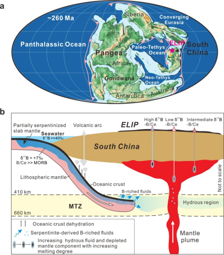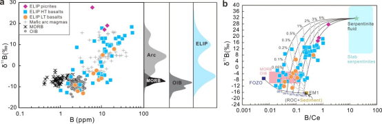 地幔柱是地球深部地幔中上升的高温、低密度物质流,通常起源于核幔边界并受到地幔过渡带影响,是地球内部物质和能量传输到地表的重要窗口。上升的地幔柱会引发大规模的岩浆活动,形成大火成岩省,出露地表的岩浆岩是地球内部物质组成的重要“岩石探针”。硼(B)作为流体活动性元素,在岩浆与变质过程中的释放行为与水的迁移密切相关。地表储库与地幔中的B含量和同位素组成相差甚远,例如海水具有较高的B含量(~4.5 ppm)和重B同位素(δ11B ≈ +40‰)组成;而亏损地幔具有非常低的B含量(< 0.1 ppm)和轻B同位素(δ11B = −7.1 ± 0.9 ‰)组成;海水与岩石圈地幔反应形成的蛇纹岩具有高B含量(可高达100 ppm)和重B同位素(δ11B 可高达+40‰)组成。基于此,对大火成岩省岩浆岩进行B含量和B同位素分析,有望为地球深部水的来源及其循环过程提供关键线索。