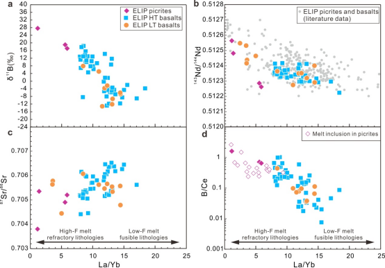 该富水端元组分应具有高B/Ce(> 1.59)和δ11B (> +27.62‰),而此特征与大洋板片蛇纹岩来源的流体组成非常类似。在排除岩浆后期蚀变、岩石圈地幔与地壳混染等一系列可能影响后,研究团队提出峨眉山苦橄岩与玄武岩如此重的B同位素组成指示其地幔源区存在大洋板片蛇纹岩来源的流体贡献。进一步的质量平衡模拟表明,峨眉山大火成岩省源区板片蛇纹岩流体贡献最高可达5%(图2b和3)。值得注意的是,峨眉山大火成岩省样品的B-Sr-Nd-Pb同位素组成、B/Ce比值均与La/Yb比值呈现系统的相关性,指示地幔源区的不均一性控制了大火成岩省岩浆岩的元素和同位素组成(图4)。蛇纹岩来源的流体在地幔柱内部的分布显示出强烈的不均一性:那些相对含水的地幔区域会经历较高程度的部分熔融,导致亏损地幔难熔组分被更多地熔融,所产生的熔体因此具有更高的δ11B、B/Ce、143Nd/144Nd和206Pb/204Pb比值以及更低的87Sr/86Sr和La/Yb比值(图4);相反,相对干的地幔区域会经历较低程度的熔融,富集易熔组分在熔体中占主导,这些熔体具有更低的δ11B、B/Ce、143Nd/144Nd和206Pb/204Pb比值以及更高的87Sr/86Sr和La/Yb比值(图4)。