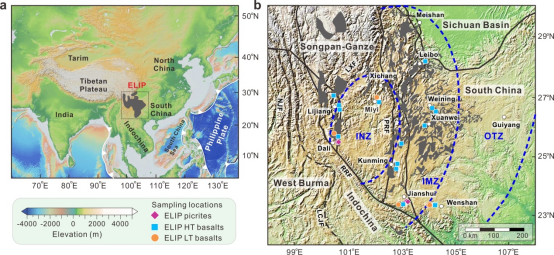 公司教授夏小平联合中国科学院广州地球化学研究所徐健副研究员、张乐高级工程师、王强研究员、徐义刚研究员等人以及帕多瓦大学的Omar Bartoli教授选择峨眉山大火成岩省的玄武岩和苦橄岩为研究对象(图1),对其开展了高精度的B含量和B同位素、元素和Sr-Nd-Pb同位素分析。