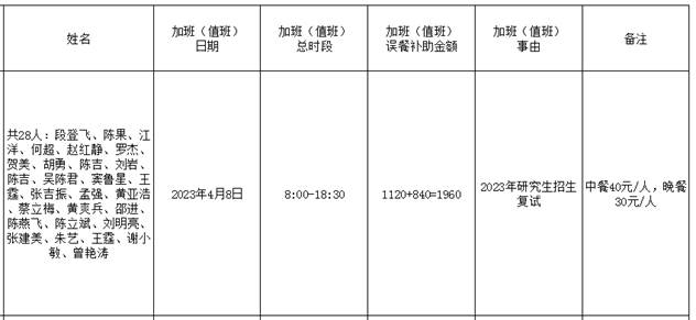 根据《bv伟德国际1946加班(值班)误餐补助管理办法(试行)》(长大校发【2019】83号)文件规定,现对bv伟德国际1946加班(值班)误餐情况(2023年4月8日)进行公示,如果对加班(值班)误餐情况有异议,可以通过电话或电子邮件等方式向bv伟德国际1946办公室反映。