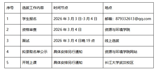 为深化拔尖创新人才培养模式改革,不断提高人才培养质量,更好地因材施教,促进优秀人才脱颖而出,现根据《bv伟德国际1946拔尖创新人才培育试验计划实施办法(试行)》[长大校发(2012)156号)]和《bv伟德国际1946普通本科生专业分流与转专业管理办法》[长大校发(2019)260号)],学校决定按照公平、公开、公正的原则,面向全校2025级本科生中遴选优秀员工,组建2025级地球化学专业“石油之光”实验班。现将有关事宜通知如下: 一、选拔范围及规模 2025级地球化学专业“石油之光”实验班从全校2025级员工中选拔产生,总人数为25人。 二、选拔条件 本次试点班员工从高考生源类型为理科的2025级本科生中选拔,申请报名员工需符合《bv伟德国际1946普通本科生专业分流与转专业管理办法》规定,同时要求德智体美劳全面发展,品学兼优,身心健康,综合素质好;具有活跃思维、创新意识、强烈竞争意识和进取精神;具有较强的自主学习能力。 三、选拔程序 (一)自愿报名申请 申请参加实验班选拔的员工填写《bv伟德国际19462025级地球化学专业“石油之光”实验班员工申请表》(见附件1),员工将填写完整的申请表(附成绩单)于3月4日下午17:00时前(word电子版)发送到邮箱:879332613@qq.com。备注:申请表中申请人签名用电子签,资格审查部分由学院统一办理,申请员工无需办理。 (二)资格审核 1. 根据相关规定对申请员工进行资格审查; 2. 涉及转专业的,按照学校和教务处相关要求进行资格审查。 (三)考核方式 考核方式为面试。面试环节包括员工自述、评审小组提问。 (四)录取 1.综合成绩=一年级(第一学期)必修课成绩×60%+面试成绩×40%(分数按百分制计算) 2. 学院根据员工资格审核、综合成绩,确定2025级地球化学专业“石油之光”实验班拟录取员工名单并公示,公示无异议后报教务处批准并备案。 四、时间安排 联系人及电话:吴陈君 17762426368 孟 强 18164270228 陈 果 13511030600 bv伟德国际1946 bv伟德国际1946 2026年3月3日