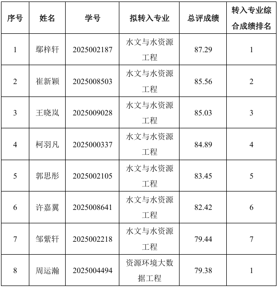 经学院审核面试,党政联席会讨论通过,现将2025级本科生春季学期转专业综合成绩排名及拟同意转入名单公示如下。